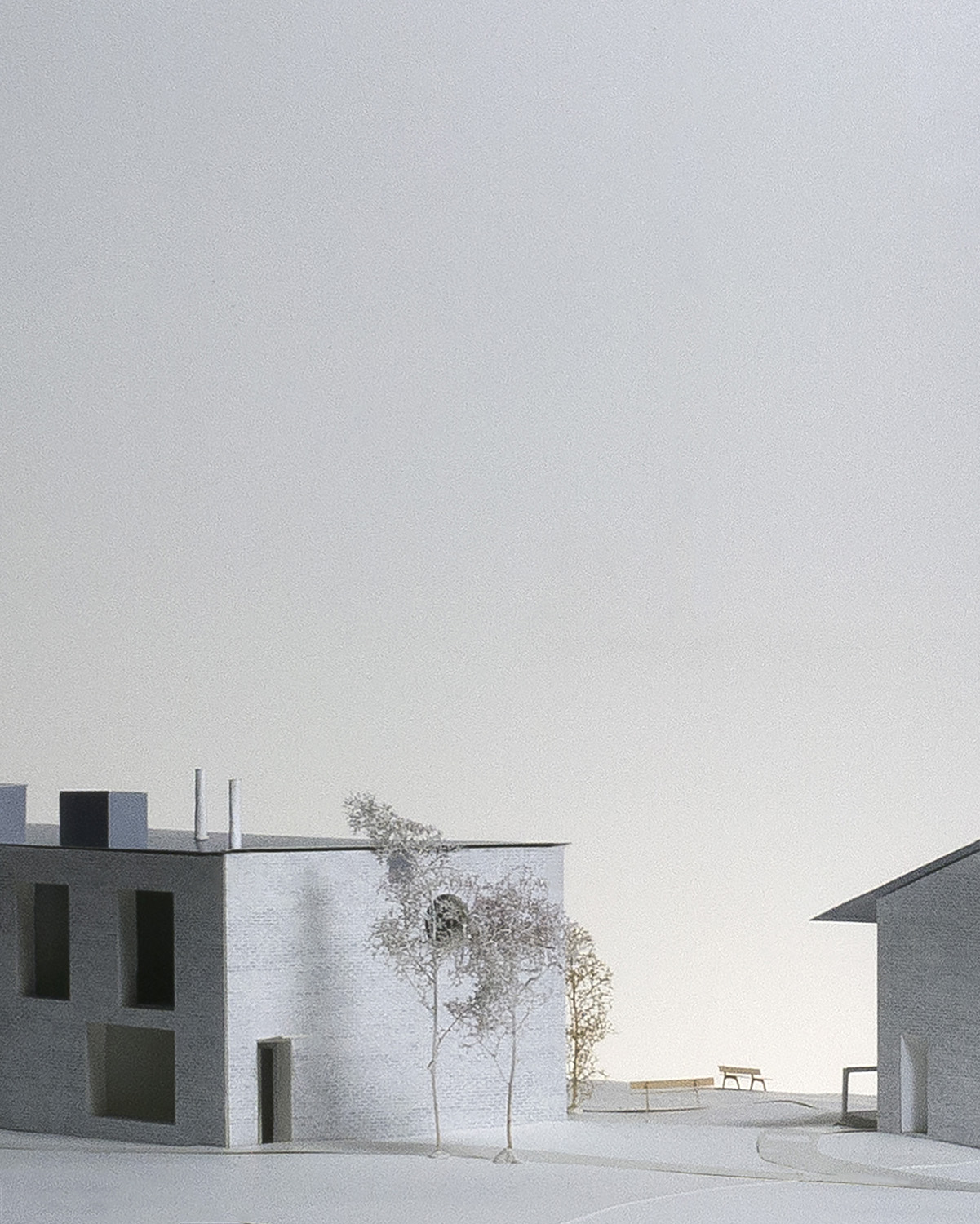 The two long buildings house 3 sets of living typologies: row-houses with exchangeable rooms, duplex apartments connected to ground-floor studio units, that in turn, can also be used independently. These typologies, designed to expand or shrink overtime, offer different qualities of interior use and relation to the outside. The row-houses, grounded to the garden, enjoy a more direct use of the exterior space with a frontal relation to the garden. Differently, the duplex apartments define a line in the rural fields, incorporating by means of a large opening the broad landscape into the double-height living spaces. The studios, underneath them, provide both access to the garden and views over the landscape thanks to a crossing dual aspect layout.